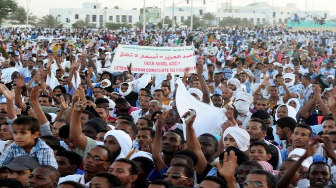 In this picture taken on May 9, 2012 Supporters of Mauritanian political oppositionists take part in a demonstration march against the country’s President Mohamed Ould Abdel Aziz in Nouakchott. Thousands of young Mauritanian opposition protestors took to the streets of Nouakchott to demand that President Mohamed Ould Abdel Aziz, a former coup leader, step down. AFP PHOTO / Mohamed Ould Elhadj